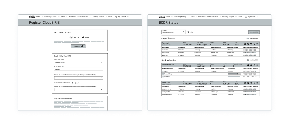 At the start of the design process, I developed low-fidelity wireframes to represent our vision for the product we want to launch. This included a three-step purchasing flow and a status page that encompassed three Datto Product lines. Following that, we reduced the number of features and broke them into phased programmed releases; Alpha, Beta, and Early Adopters Program (EAP).